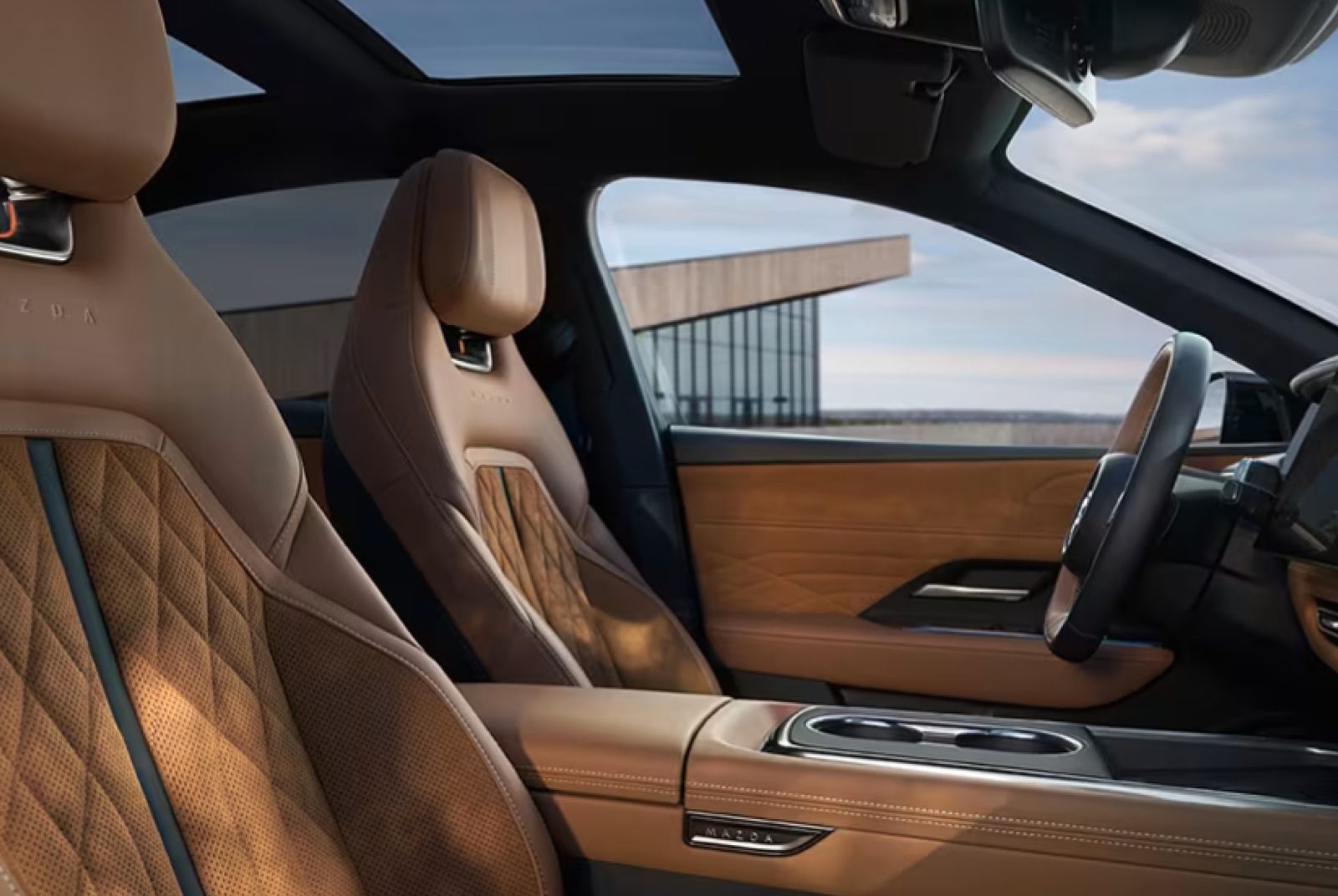 Het interieur van de Mazda6e ademt het Japanse principe Ma: licht en open ruimte. Dankzij het panoramadak geniet je van een overvloed aan daglicht, terwijl de verfijnde afwerking en exclusieve materialen de cabine extra luxe maken.